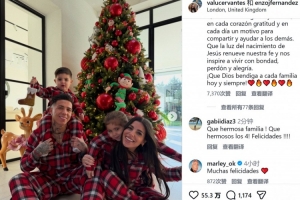 體育資訊12月26日訊 切爾西中場恩佐更新社媒,曬出圣誕節(jié)合照,并寫下圣誕節(jié)祝福。