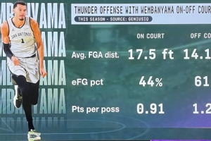 文班在場(chǎng)時(shí),雷霆的平均出手距離是17.5英尺(約5.3米)、而他不在場(chǎng)時(shí)出手距離平均是14.1英尺(約4.3米)。文班在場(chǎng)時(shí),雷霆的有效命中率僅為44%,他不在場(chǎng)時(shí)是61%。文班在場(chǎng)時(shí),雷霆每回合得分為0.91分,他不在場(chǎng)時(shí)是1.24分。
