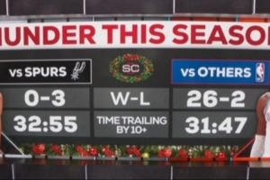 雷霆賽季至今打馬刺:0勝3負 落后兩位數(shù)時間32分55秒
