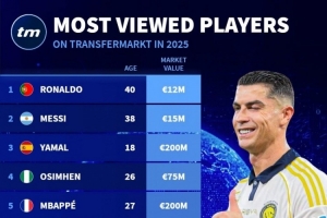 2025年德轉(zhuǎn)球員信息瀏覽量排名:C羅居首,梅西、亞馬爾二三位
