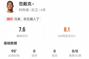 體育資訊12月28日訊 利物浦在本輪英超對(duì)陣?yán)顷?duì),范戴克本場(chǎng)數(shù)據(jù)如下: