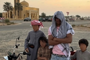 在社交媒體上,亞馬爾曬出了和阿拉伯兒童在一起的照片,他自己則“頭頂一塊布”化身阿拉伯人,戴著墨鏡的他酷勁十足。