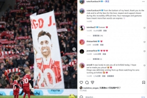 若塔的遺孀魯特爾也在賽后通過社媒曬出現(xiàn)場照表示感謝:“我由衷感謝俱樂部和所有球迷在這段無比艱難的時期所展現(xiàn)出的愛、尊重和支持。你們的留言以及行動讓我感動到難以用言語表達??”。