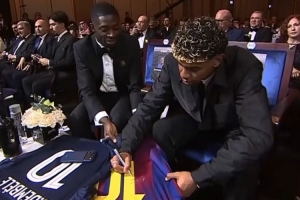 2025金球獎冠亞軍!亞馬爾、登貝萊在環(huán)足獎典禮互贈簽名球衣