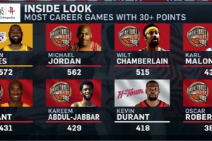 火箭主場(chǎng)迎戰(zhàn)步行者,轉(zhuǎn)播方曬出歷史30+場(chǎng)次排名,杜蘭特418場(chǎng)排名第七。