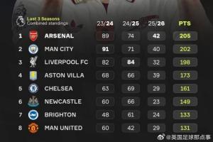 433統(tǒng)計最近三個賽季英超總積分:阿森納排名第一,維拉與紐卡也成功躋身前六??