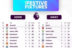本賽季英超主客場積分榜:阿森納主場25分最多、客場17分并列最多