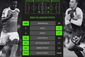 薩卡、羅杰斯聯(lián)賽數(shù)據(jù)對(duì)比:后者進(jìn)球助攻更多,前者關(guān)鍵傳球更多