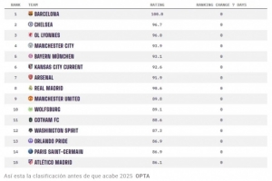 相比之下,男足的排名則有所不同。阿森納以滿分100分位居榜首,拜仁慕尼黑(98.2分)和曼徹斯特城(98.1分)分列第二和第三位。巴黎圣日耳曼(96.5分)和巴塞羅那(95.6分)也名列前茅?;始荫R德里男足目前排名第10,評(píng)分為93.4分,在最近一次更新中下降了兩個(gè)位置。切爾西(第8位,93.7分)和國(guó)際米蘭(第9位,93.6分)都超過了他們。
