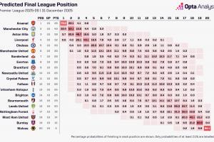 體育資訊12月31日訊 2025年英超比賽結(jié)束,半程過后,槍手領(lǐng)跑英超積分榜。