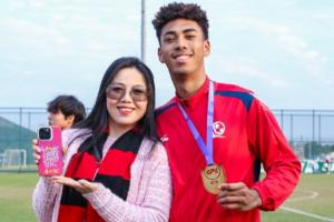 體育資訊12月31日訊 恒大足球學校全勝奪得U17精英聯(lián)賽冠軍,賽后張洪福的媽媽與兒子合影慶祝。