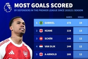 體育資訊12月31日訊 《轉(zhuǎn)會市場》統(tǒng)計了20-21賽季以來的英超后衛(wèi)進(jìn)球情況,槍手中衛(wèi)加布里埃爾獨自領(lǐng)跑。