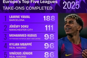 體育資訊12月31日訊 2025年即將結(jié)束,squawka也統(tǒng)計(jì)了本年度成功過(guò)人情況,亞馬爾斷崖領(lǐng)跑。