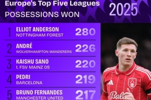 體育資訊12月31日訊 2025年即將結(jié)束,數(shù)據(jù)機構(gòu)squawka也統(tǒng)計了本年度五大聯(lián)賽奪回球權(quán)情況,諾丁漢森林中場埃利奧特·安德森獨自領(lǐng)跑。