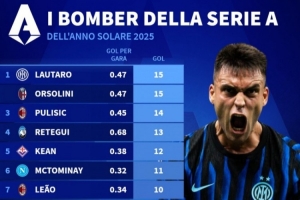 體育資訊1月1日訊 德轉(zhuǎn)列2025年意甲射手榜,勞塔羅與奧爾索里尼15球并列第一。