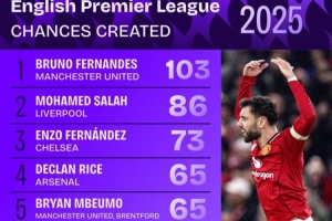 2025年英超創(chuàng)造機會榜:B費103次第一,薩拉赫86次第二,恩佐第三