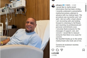 卡洛斯曬出自己在醫(yī)院的照片,并配文寫道:“我想澄清一下最近流傳的一些信息,我最近接受了一項(xiàng)預(yù)防性醫(yī)療程序,這項(xiàng)程序是事先與我的醫(yī)療團(tuán)隊(duì)商定的。程序很成功,我目前身體狀況良好,我沒(méi)有心臟病發(fā)作?!?/p>