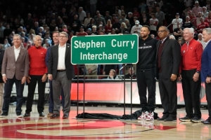 庫(kù)里曬”庫(kù)里30號(hào)立交“路牌:永遠(yuǎn)勇敢追夢(mèng) 全程心懷感恩!