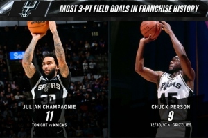 11記三分打破馬刺隊(duì)史單場三分球命中紀(jì)錄,此前由查克·珀森保持(9記)。