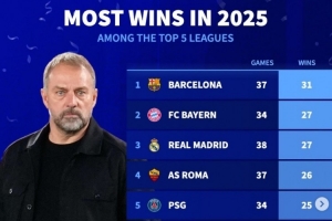 2025五大聯(lián)賽勝場(chǎng)榜:巴薩31勝居首,拜仁皇馬各27勝、羅馬26勝