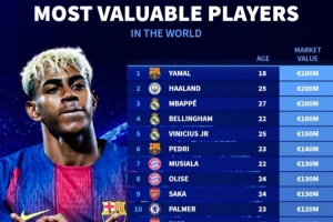 德轉(zhuǎn)列全球身價(jià)榜:亞馬爾、哈蘭德+皇馬3巨星列前五 前20意甲0人
