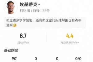 ?;倏吮緢?射1正1失良機+3越位 18對抗6成功 獲評6.7分