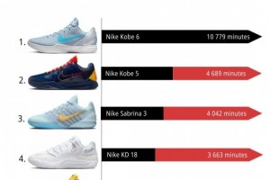 體育資訊1月2日訊 球鞋媒體kixstats統(tǒng)計了12月份NBA球員上腳球鞋的總時長排行,其中科比的兩款球鞋排名前二,Kobe 6依舊是斷檔第一。WNBA球星約內(nèi)斯庫的Sabrina 3排名第三。