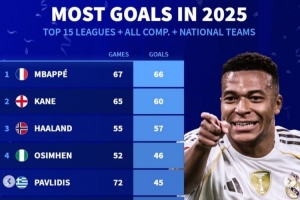 體育資訊1月2日訊 2025年已經(jīng)過去,《轉(zhuǎn)會市場》也統(tǒng)計了2025前15聯(lián)賽球員的俱樂部+國家隊各項賽事總進(jìn)球情況,皇馬前鋒姆巴佩領(lǐng)跑。