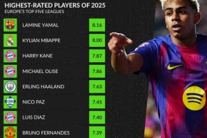 體育資訊1月3日訊 whoscored統(tǒng)計了2025年五大聯(lián)賽場均評分榜,亞馬爾力壓姆巴佩居首。