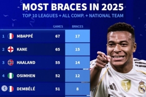 體育資訊1月3日訊 2025年已經(jīng)過去,《轉(zhuǎn)會市場》也統(tǒng)計了2025年前十聯(lián)賽球員的俱樂部+國家隊各項賽事雙響次數(shù)和戴帽次數(shù),姆巴佩同時領(lǐng)跑雙榜。