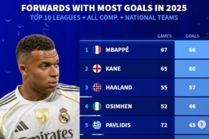 體育資訊1月4日訊 《轉(zhuǎn)會市場》統(tǒng)計了2025年前十聯(lián)賽前鋒的俱樂部+國家隊各項賽事進(jìn)球最多情況,姆巴佩居首。