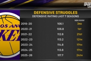 湖人主場迎戰(zhàn)灰熊,賽前轉播方給出了湖人過去7個賽季的防守效率排名。