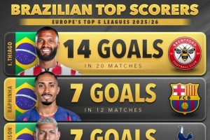 體育資訊1月5日訊 Score90統(tǒng)計了本賽季巴西球員在五大聯(lián)賽的進球數(shù)量,并列出榜單,伊戈爾·蒂亞戈14球斷層居首。
