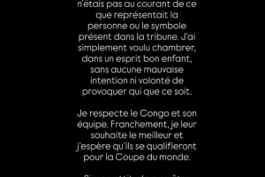 我尊重民主剛果及其國家隊。老實說,我衷心希望他們一切順利,也希望他們能成功晉級世界杯。如果我的行為被誤解了,我對此深感遺憾,因為這完全不是我的本意。