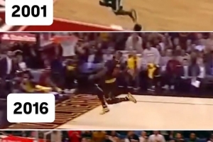 詹姆斯轉(zhuǎn)發(fā)了媒體發(fā)布的他分別在2001年、2016年及2026年完成招牌式搶斷后大風(fēng)車扣籃對比畫面。