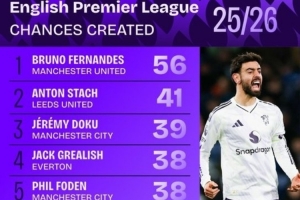 體育資訊1月9日訊 數(shù)據(jù)機(jī)構(gòu)squawka統(tǒng)計(jì)了本賽季英超創(chuàng)造機(jī)會(huì)榜,曼聯(lián)隊(duì)長(zhǎng)B費(fèi)斷崖領(lǐng)跑。