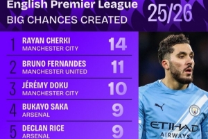 本賽季英超創(chuàng)造重大機(jī)會(huì)榜: