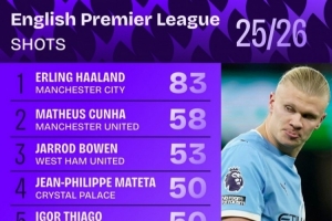 本賽季英超射門次數(shù)榜:哈蘭德83次斷層居首,庫尼亞58次第二