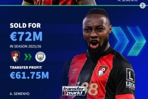 體育資訊1月10日訊 曼城已經(jīng)官宣簽下塞梅尼奧,《轉(zhuǎn)會(huì)市場(chǎng)》統(tǒng)計(jì)顯示這也是伯恩茅斯近年來通過轉(zhuǎn)賣盈利最多的一筆交易(單位:歐元)。