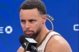 賽后,庫里接受媒體采訪期間記者手機(jī)鈴聲響了,庫里隨即跟隨音樂開始扭動(dòng)身體。