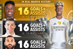 皇馬隊(duì)史決賽參與進(jìn)球榜:維尼修斯16球追平C羅并列榜首