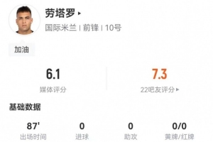 體育資訊1月12日訊 國米在本輪意甲對陣那不勒斯,勞塔羅本場數(shù)據(jù)如下:
