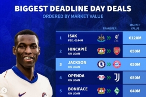 體育資訊9月3日訊 主流聯(lián)賽夏窗已經(jīng)關(guān)窗,《轉(zhuǎn)會市場》也統(tǒng)計了夏窗截止日轉(zhuǎn)會球員的最貴身價榜情況,伊薩克無懸念領(lǐng)跑。