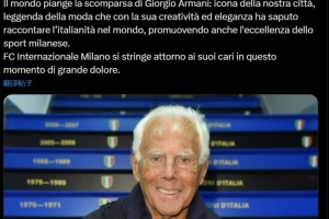 國米官方寫道:“全世界都在為喬治-阿瑪尼的離世而哀悼:他是我們城市的象征,是時(shí)尚界的傳奇人物,以其創(chuàng)意與優(yōu)雅將意大利精神傳遞到全世界,同時(shí)也推廣了米蘭城體育的卓越形象?!?/p>