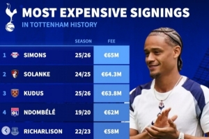 列維熱刺生涯最貴引援榜:歐元