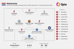 體育資訊9月5日訊 荷蘭在本輪世預(yù)賽主場1-1戰(zhàn)平波蘭,荷蘭隊(duì)本場比賽首發(fā)有8人都來自英超。