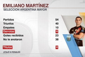 據(jù)ESPN統(tǒng)計(jì),大馬丁為阿根廷國(guó)家隊(duì)出戰(zhàn)54場(chǎng)比賽,僅輸?shù)羝渲?場(chǎng)。