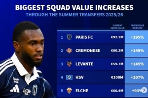 體育資訊9月7日訊 《轉(zhuǎn)會市場》統(tǒng)計(jì)了今夏轉(zhuǎn)會窗過后的總身價(jià)上升比例情況,多家升班馬霸榜。