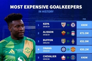 體育資訊9月9日訊 德國轉(zhuǎn)會市場統(tǒng)計了門將的轉(zhuǎn)會費,并列出榜單,凱帕8000萬歐居首,阿利森、布馮、奧納納排名前四。