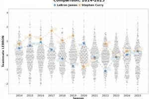 體育資訊9月12日訊 近日,數(shù)據(jù)媒體BBall-Index曬圖比較了2014-2025年期間詹姆斯和庫(kù)里的隊(duì)友強(qiáng)度。